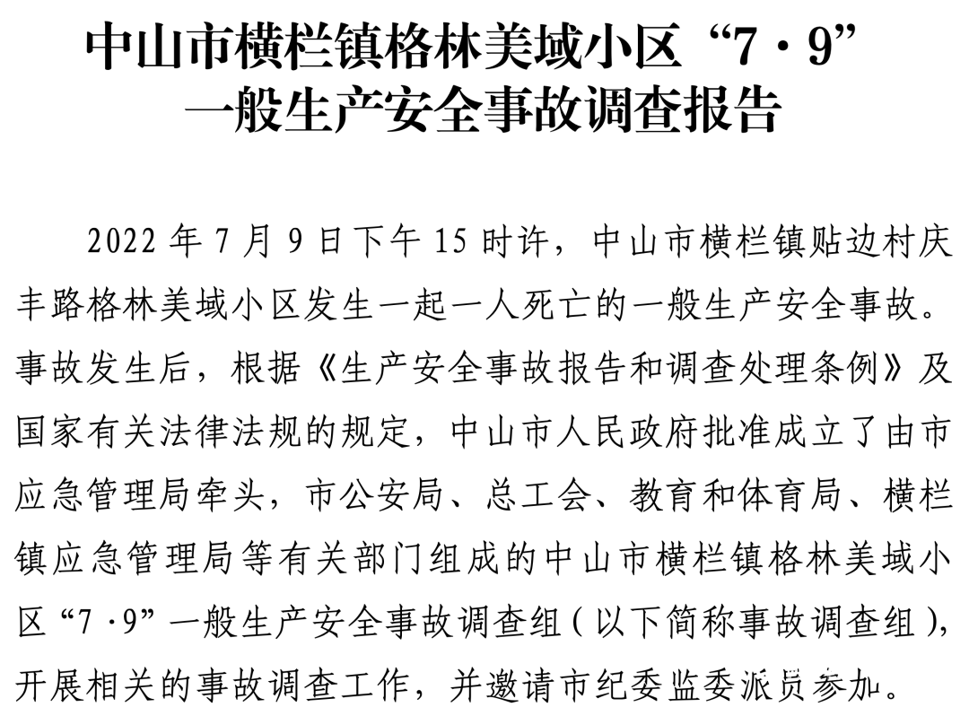 2026年3月12日,广东省中山市应急管理局发布《中山市横栏镇格林美域小区“7·9” 一般生产安全事故调查报告》(以下简称《报告》)。