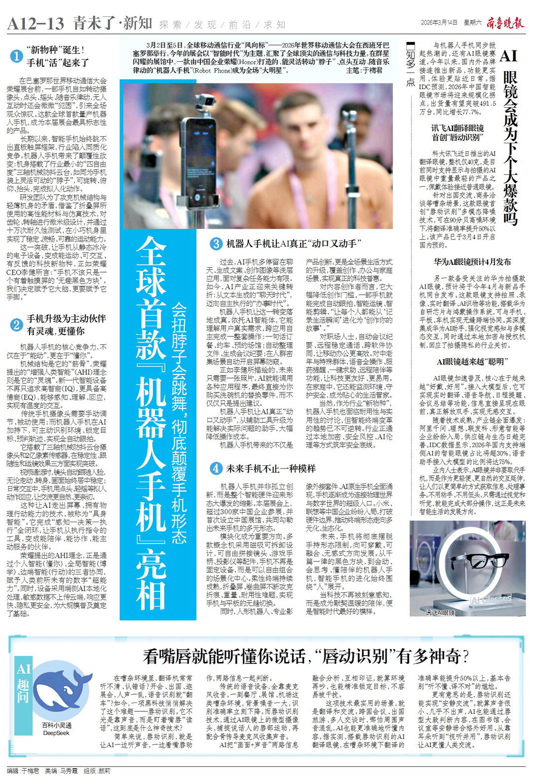 3月2日至5日,全球移动通信行业“风向标”——2026年世界移动通信大会在西班牙巴塞罗那举行。今年的展会以“智能时代”为主题,汇聚了全球顶尖的通信与科技力量。在群星闪耀的展馆中,一款由中国企业荣耀(Honor)打造的、能灵活转动“脖子”、点头互动、随音乐律动的“机器人手机”(Robot Phone)成为全场“大明星”。