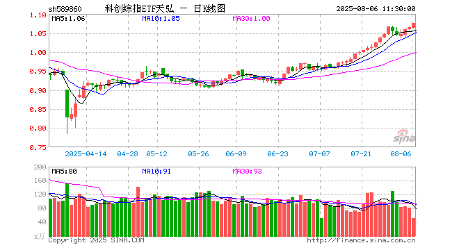 8月6日,截止午间收盘,科创综指ETF天弘(589860)涨0.94%,报1.075元,成交额5477.93万元。科创综指ETF天弘(589860)重仓股方面,海光信息截止午盘跌3.70%,寒武纪跌0.63%,中芯国际涨0.01%,金山办公跌0.13%,百利天恒涨4.58%,中微公司涨0.11%,联影医疗涨0.46%,澜起科技涨6.73%,传音控股涨0.83%,华润微涨0.51%。